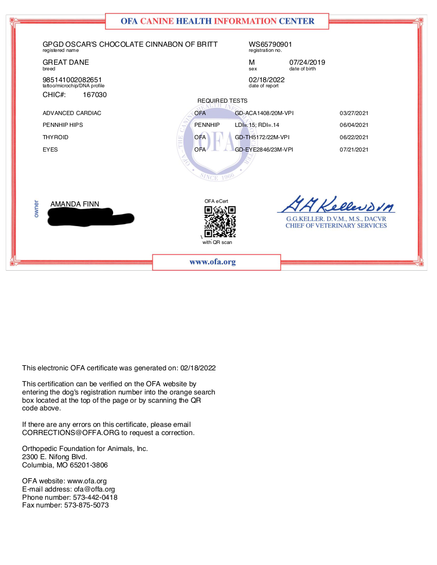 Oscar is our Chocolate Fawn Male. He was born July of '19 in North Carolina. He finished his health testing and received his CHIC number in July of '21 His hips came back in the Top 5% for his breed. He had his first litter in September of '21. He carries Blue. He will eventually be available for stud to outside kennels/other CHIC certified females.